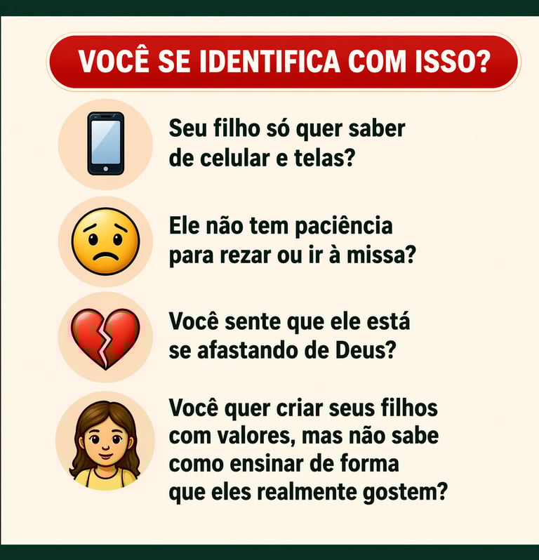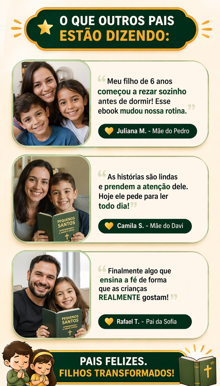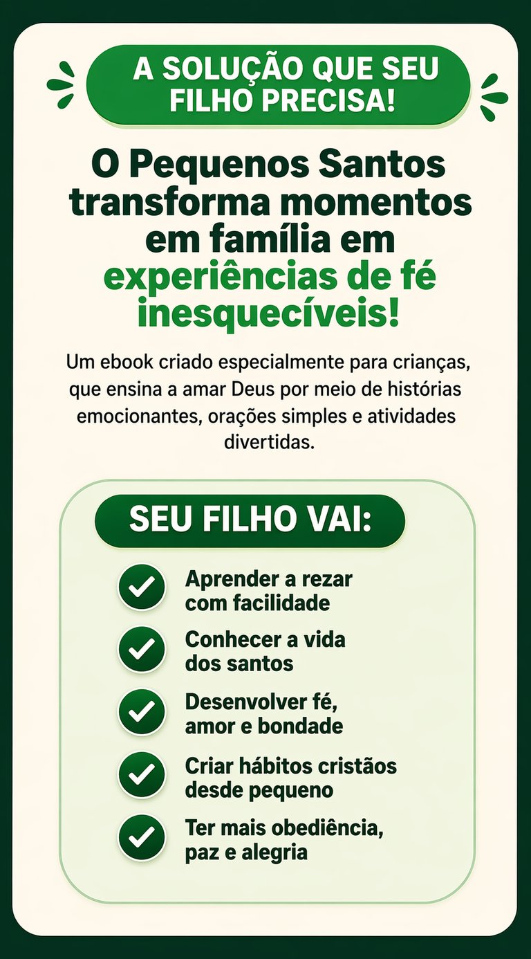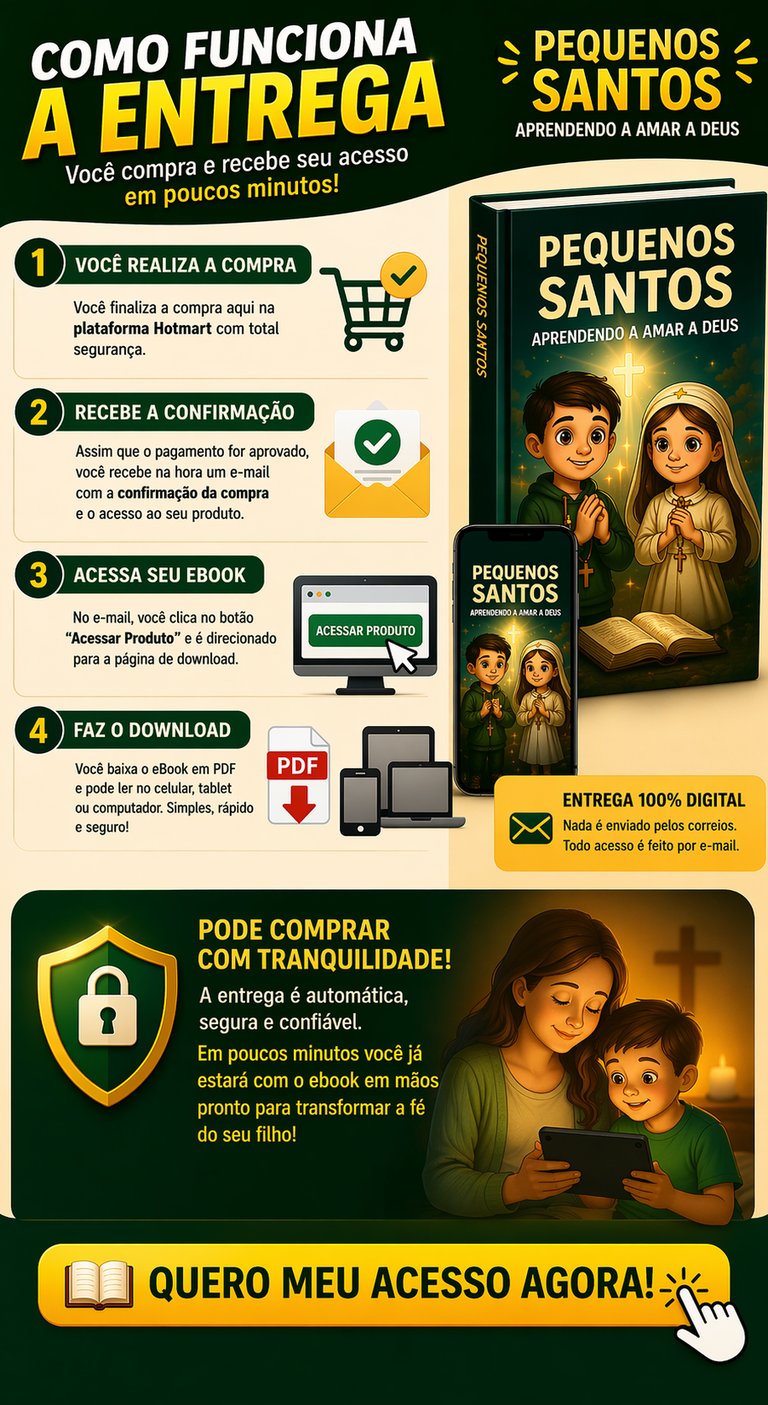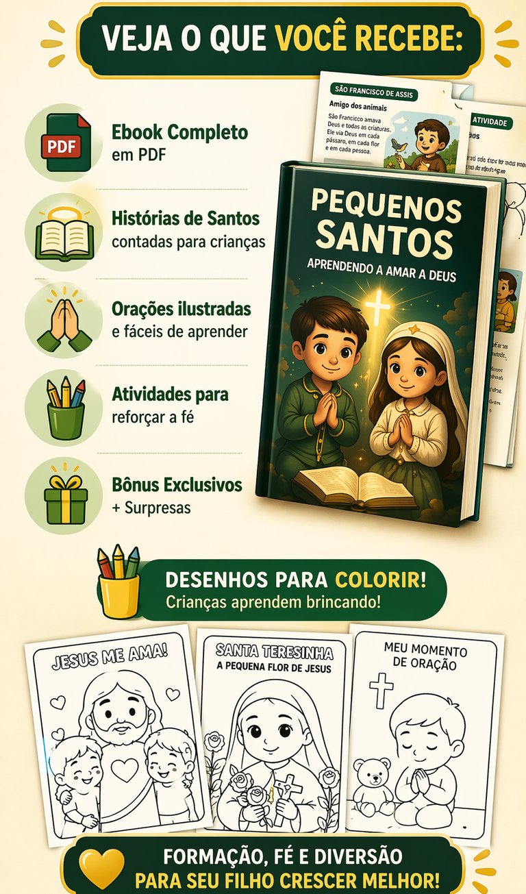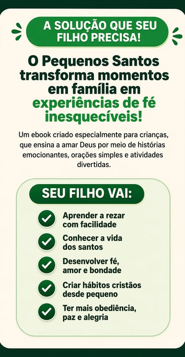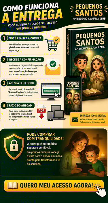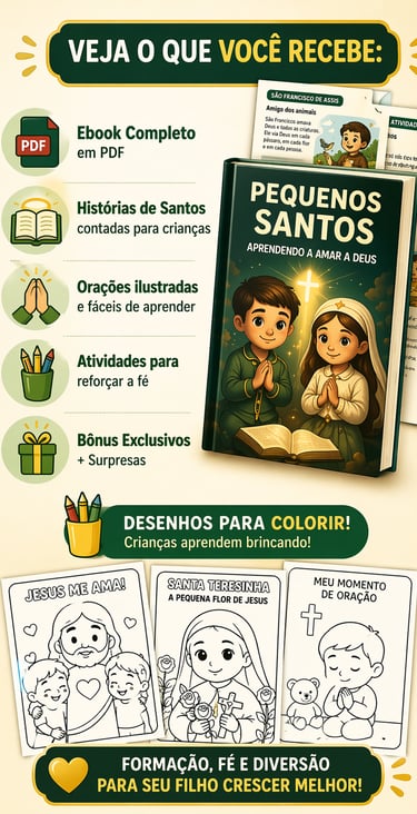 Mesmo que ele não goste de rezar, com o Pequenos Santos você ensina seu filho a amar Deus de forma leve, divertida e sem pressão — criando hábitos que vão acompanhar ele por toda a vida.
